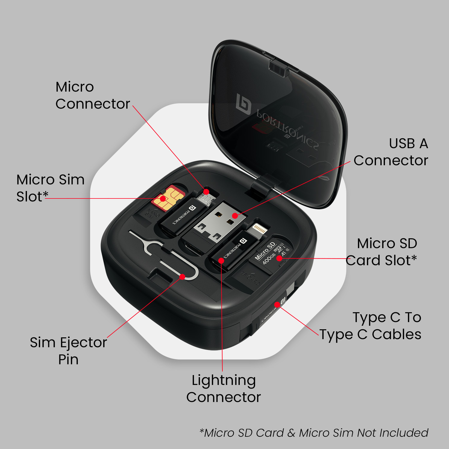Say goodbye to tangled cables and lost connectors! The Portronics Snap Case is your one-stop solution for managing all your tech essentials. This multipurpose case features dedicated slots for Type-C to Type-C and Type-C to Micro/Lightning cables. Now keep your tech essentials organized and easily accessible. It even holds various converters and connectors, including USB to Type-C, Lightning to Type-C, and Type-C to USB, ensuring you’re always prepared for any connection need. The included Type-C to Type-C cable allows for rapid charging and flawless data transfer for your devices. The cable card itself boasts additional cables with a powerful 60W maximum output, perfect for charging all your gadgets on the go. Never worry about losing your Nano SIM or TF card again as Snap Case provides secure storage for both. The tech accessory is ideal for travelers and users with multiple devices. Plus, a precision SIM ejector tool helps in flawless SIM card removal. Made from high-durability ABS plastic, the Snap Case is built to last, offering impact and resistance. It is meant for those who yearn for everyday use products in their life. An integrated, stylish mirror lets you stay touch-up ready for meetings or quick fixes throughout the day. And for ultimate convenience, the case features an adjustable mobile stand, allowing you to enjoy hands-free viewing, video calls, or reading at optimal angles – perfect for entertainment or work on the move. With the Portronics Snap Case, organization, functionality, and style come together seamlessly, making it your must-have travel companion!